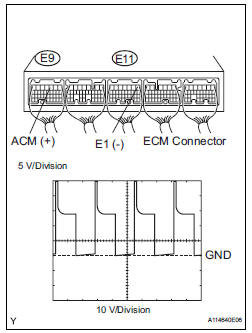(a) Connect the oscilloscope between terminals ACM and E1 of the E9 and E11 ECM connectors.