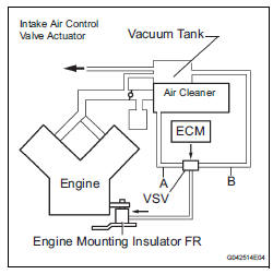 The Active Control Engine Mount (ACM) system decreases engine vibration at engine idling using the ACM VSV. The VSV is controlled by a pulse signal transmitted to the VSV from the ECM. The frequency of this pulse signal is matched to the engine speed to decrease engine vibration.