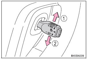 In the constant speed control mode , the set speed will be increased or decreased as follows: Fine adjustment: By approximately 1 mph (1.6 km/h) each time the lever is operated Large adjustment: The set speed can be increased or decreased continually until the lever is released.
