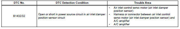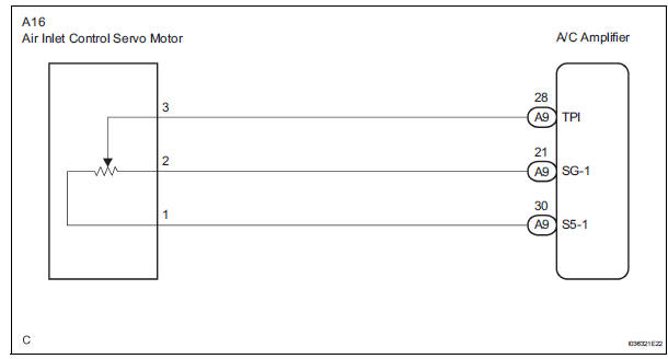 This sensor detects the position of the air inlet control servo motor and sends the appropriate signals to the A/C amplifier. The position sensor is built in the air inlet control servo motor.