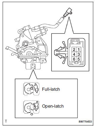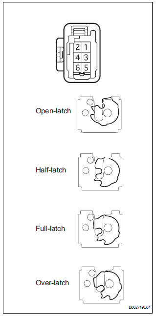 Standard: The latch turns to the open-latch position If operation is not as specified, replace the door lock assembly.