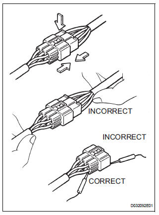 (1) Checking when a connectors is disconnected: Squeeze the connector together to confirm that they are fully connected and locked.