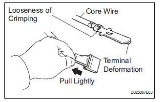 (2) Checking when a connector is disconnected: Check by pulling the wire harness lightly from the backside of the connector. Look for unlatched terminals, missing terminals, loose crimps or broken conductor wires. Check visually for corrosion, metallic or foreign matter and water, and bent, rusted, overheated, contaminated, or deformed terminals.