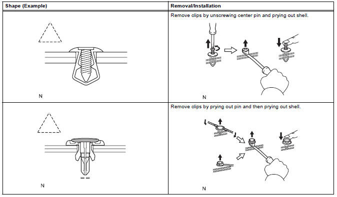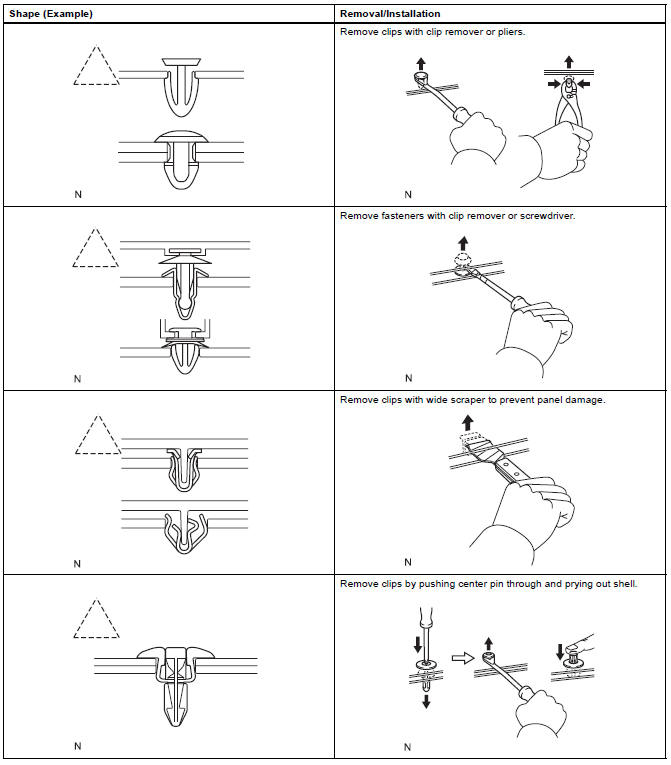 (1) The removal and installation methods of typical clips used for vehicle body parts are shown in the table below.