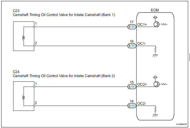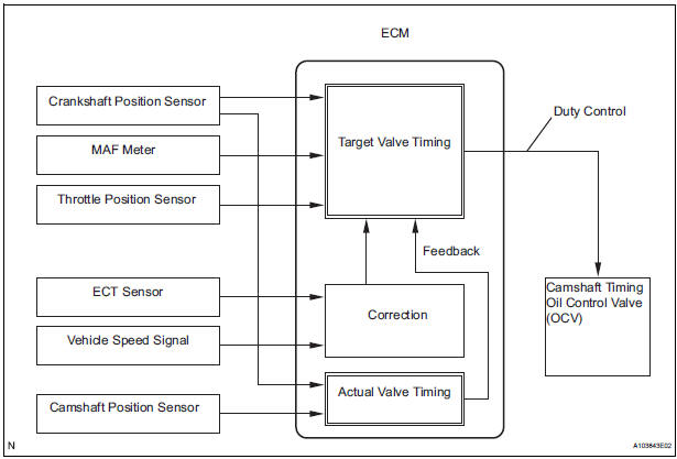 The ECM controls the OCV, based on the signals transmitted by several sensors. The VVT controller regulates the intake camshaft angle using oil pressure through the OCV. As a result, the relative positions of the camshaft and crankshaft are optimized, the engine torque and fuel economy improves, and the exhaust emissions decrease under overall driving conditions. The ECM detects the actual intake valve timing using signals from the camshaft and crankshaft position sensors, and performs feedback control.