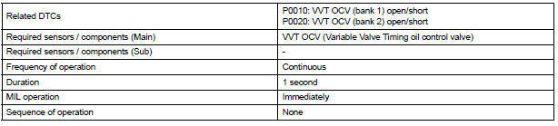 | P0010 | Open or short in OCV for intake camshaft (bank 1) circuit (1 trip detection logic) |