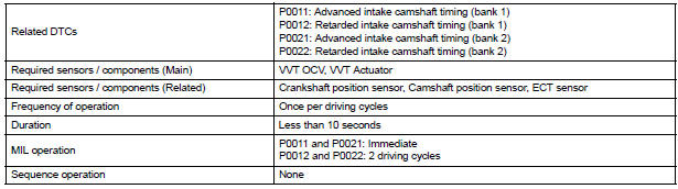 DTCs P0011 and P0021 (Advanced Cam Timing) are detected with 1 trip detection logic.