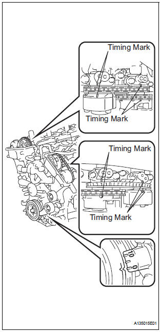 OK: The timing marks of the camshaft pulley and the camshaft bearing cap align when the notch of the crankshaft pulley is in the "0" position.