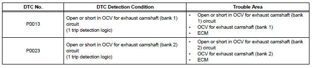 The Variable Valve Timing (VVT) system includes the ECM, OCV and VVT controller. The ECM sends a target duty-cycle control signal to the OCV. This control signal regulates the oil pressure supplied to the VVT controller. Camshaft timing control is performed according to engine operating conditions such as the intake air volume, throttle valve position and engine coolant temperature. The ECM controls the OCV, based on the signals transmitted by several sensors. The VVT controller regulates the exhaust camshaft angle using oil pressure through the OCV. As a result, the relative positions of the camshaft and crankshaft are optimized, the engine torque and fuel economy improve, and the exhaust emissions decrease under overall driving conditions. The ECM detects the actual exhaust valve timing using signals from the camshaft and crankshaft position sensors, and performs feedback control. This is how the target intake valve timing is verified by the ECM.