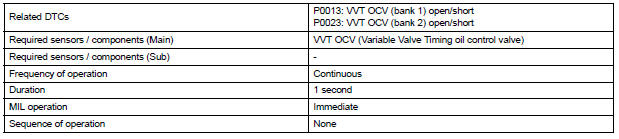 After the ECM sends the target duty-cycle signal to the OCV, the ECM monitors the OCV current to establish an actual duty-cycle. The ECM determines the existence of a malfunction and sets the DTC when the actual duty-cycle ratio varies from the target duty-cycle ratio.
