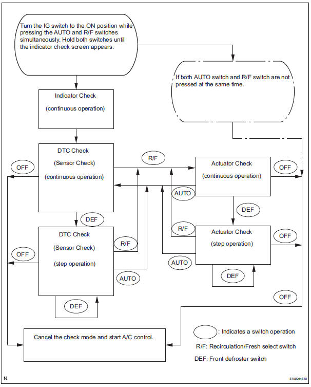 By operating each of the A/C control switches as shown in the diagram below, it is possible to enter the diagnosis check mode.