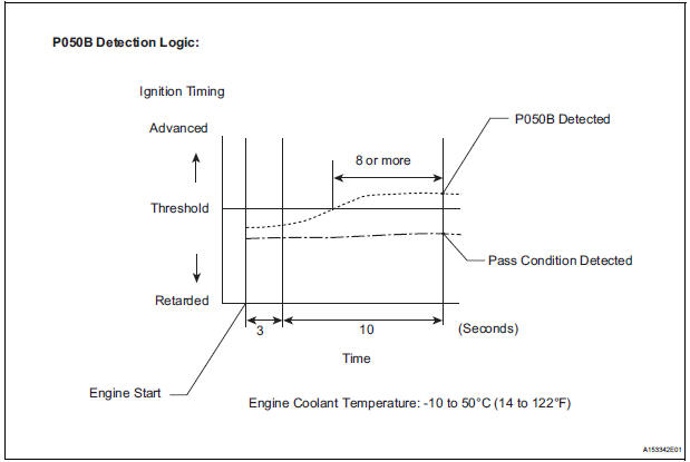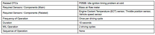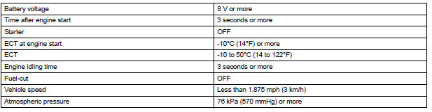 This monitor will run when the engine is started at -10 to 50°C (14 to 122°F) of the engine coolant temperature. The DTC will set after the engine idling for 13 seconds (2 trip detection logic).