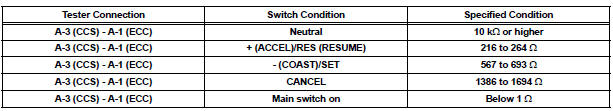 The cruise control main switch operates 7 functions: SET, - (COAST), TAP-DOWN, RES (RESUME), + (ACCEL), TAP-UP, and CANCEL. The SET, TAP-DOWN, and - (COAST) functions, and the RES (RESUME), TAP-UP, and + (ACCEL) functions are operated with the same switch. The cruise control main switch is an automatic return type switch which turns on only while operating it in the direction of each arrow and turns off after releasing it. The internal contact point of the cruise control main switch is turned on with the switch operation. Then the ECM reads the voltage value that has been changed by the switch operation to control SET, - (COAST), RES (RESUME), + (ACCEL), and CANCEL.