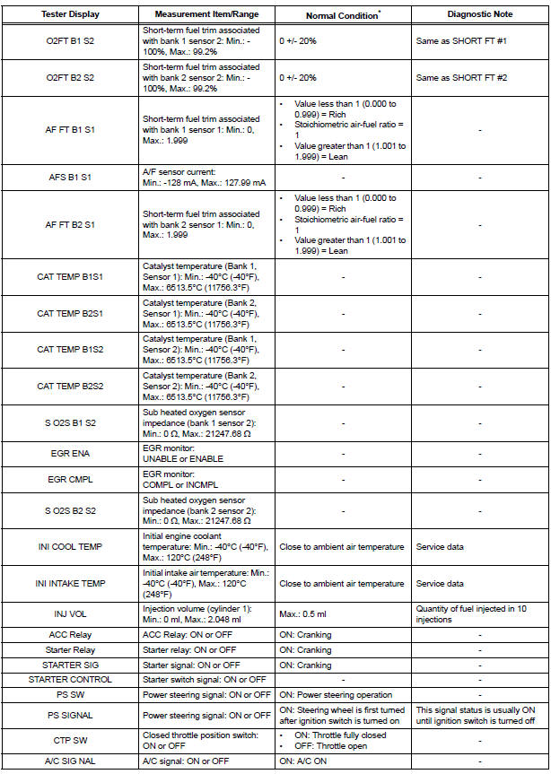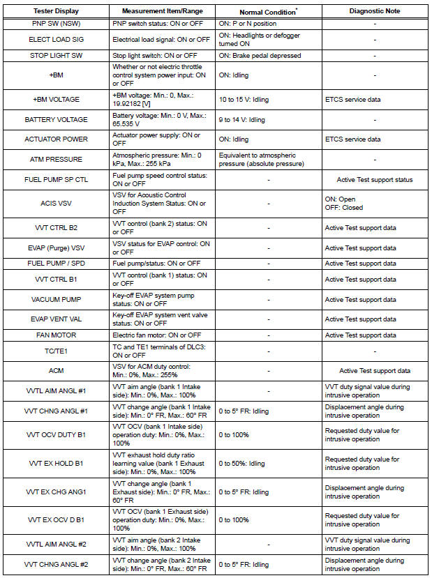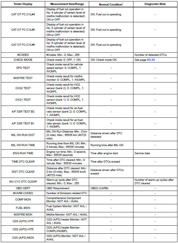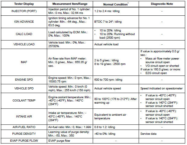 | NOTICE: In the table below, the values listed under Normal Condition are for reference only. Do not depend solely on these values when determining whether or not a part is faulty. |