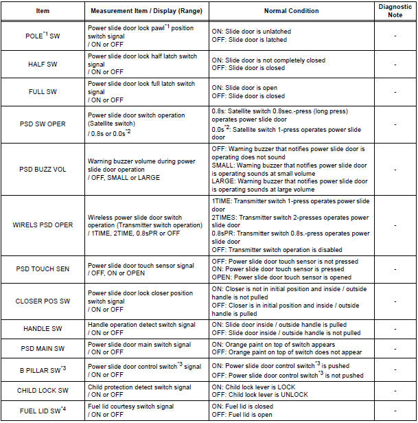*3 "B PILLAR SW" appears on the display of the intelligent tester, however the name of the part corresponding to the display of the tester is "Power slide door control switch".