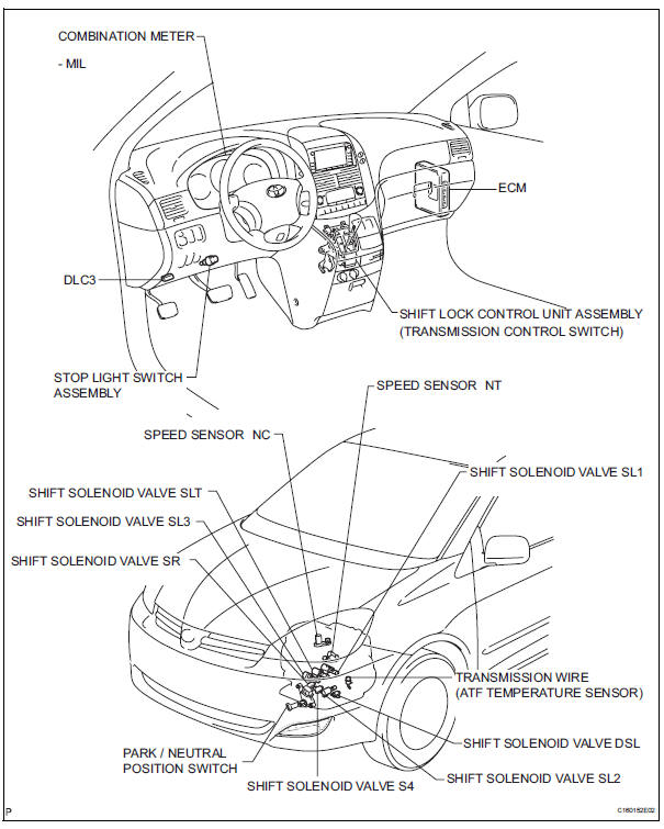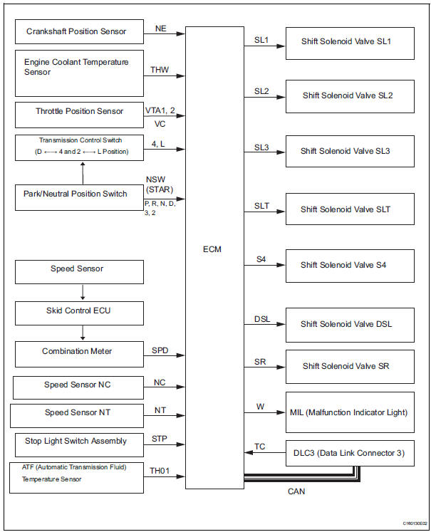 The configuration of the electronic control system in the U151E automatic transaxles is as shown in the following chart.