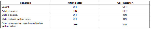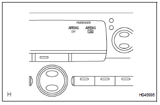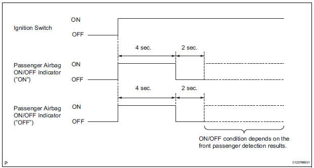 HINT: Refer to the table in the previous step regarding the passenger airbag ON/OFF indicator when the ignition switch is turned to the ON position and approximately 6 seconds have elapsed.