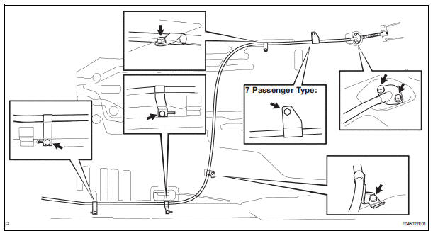 (c) Remove the 6 bolts and disconnect the parking brake cable assembly No. 1 from the floor. (Except 7 Passenger Type) (d) Remove the 7 bolts and disconnect the parking brake cable assembly No. 1 from the floor. (7 Passenger Type) (e) Disconnect the parking brake cable No. 1 from the parking brake equalizer, and remove the parking brake cable No. 1.