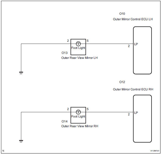 When the outer mirror control ECU receives the signal(s) from the body ECU through BEAN communication, it illuminates the foot light. The foot light is installed on the bottom of the outer rear view mirror and comes on or does off according to the following conditions.