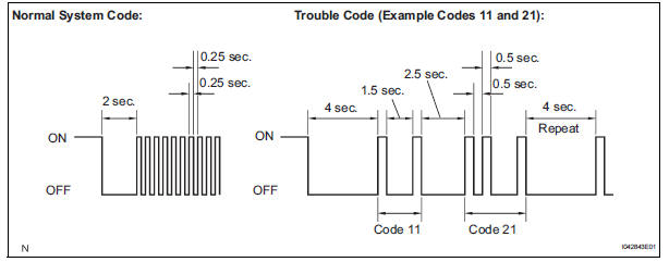 (4) As an example, refer to the chart below for the blinking patterns of the normal system code and trouble codes 11 and 21.