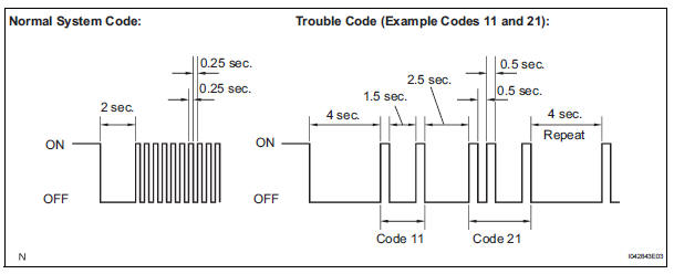 (4) As an example, the illustration below shows the blinking patterns of the normal system code and trouble codes 11 and 21.