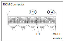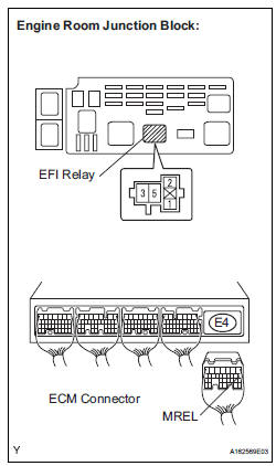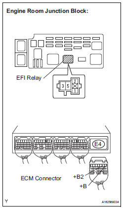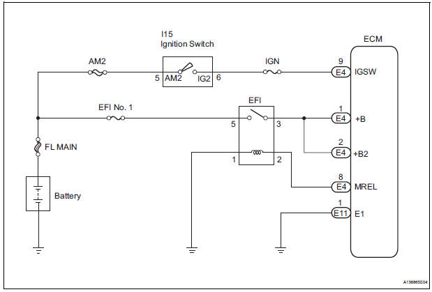 When the ignition switch is turned to the ON position, the battery voltage is applied to terminal IGSW of the ECM. The ECM MREL output signal causes a current to flow to the coil, closing the contacts of the EFI relay and supplying power to terminal +B of the ECM.