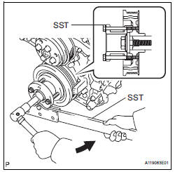 (b) Using SST, remove the crankshaft pulley bolt and crankshaft pulley.