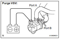 | Purge VSV (Vacuum Switching Valve) | Opens or closes line between canister and intake manifold. ECM uses purge VSV to control EVAP purge flow. In order to discharge EVAP absorbed by canister to intake manifold, ECM opens purge VSV. EVAP discharge volume to intake manifold is controlled by purge VSV duty cycle ratio (current-carrying time). (Open: ON, Close: OFF) |
