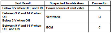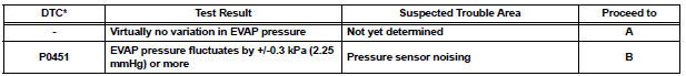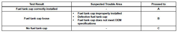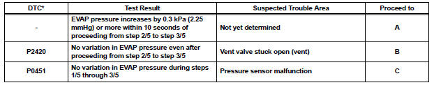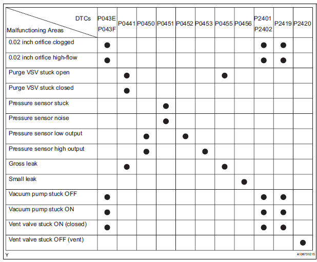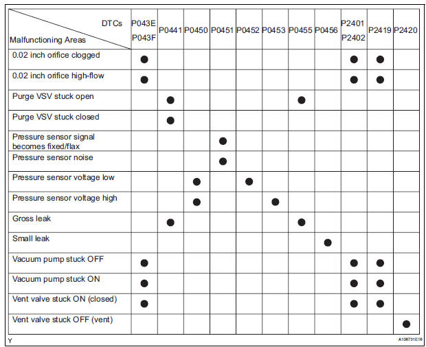 If any EVAP system DTCs are set, the malfunctioning area can be determined using the table below.