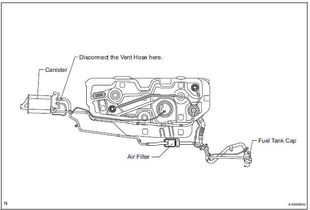| NOTICE: When replacing the canister, check the canister pump module interior and related pipes for water, fuel and other liquids. If liquids are present, check for disconnections and/or cracks in the following: 1) the pipe from the air inlet port to the canister pump module; 2) the canister filter; 3) the fuel tank vent hose. |