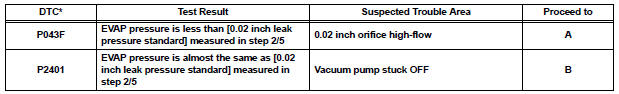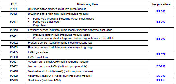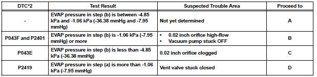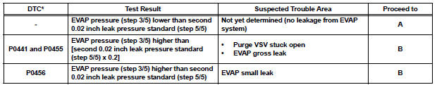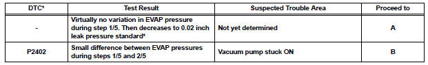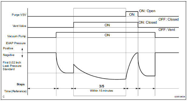 | NOTICE: If the 0.02 inch reference pressure difference between the first and second checks is greater than the specification, the DTCs corresponding to the reference pressure (P043E, P043F, P0441, P0455, P0456, P2401, P2420) will be all stored. |