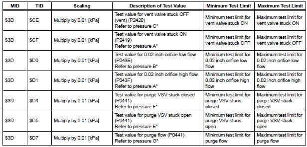 The test value and test limit information are described as shown in the following table. This information is included in MONITOR RESULT of the emissions-related DTC sections: