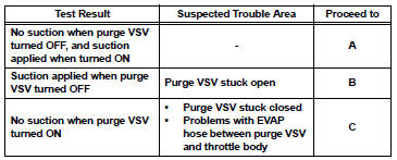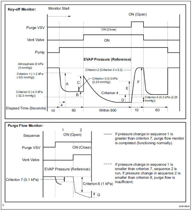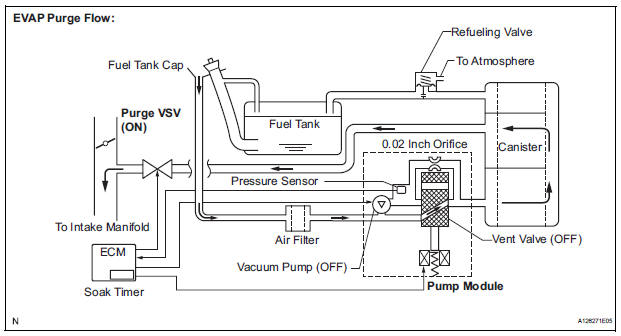 While the engine is running and the purge VSV (Vacuum Switching Valve) is ON (open), the ECM monitors the purge flow by measuring the EVAP pressure change. If negative pressure is not created, the ECM begins the 2nd monitor.