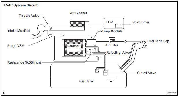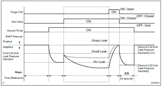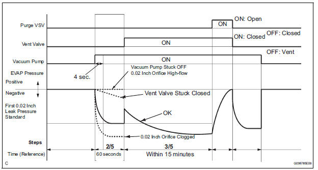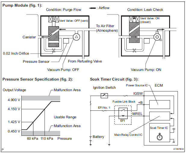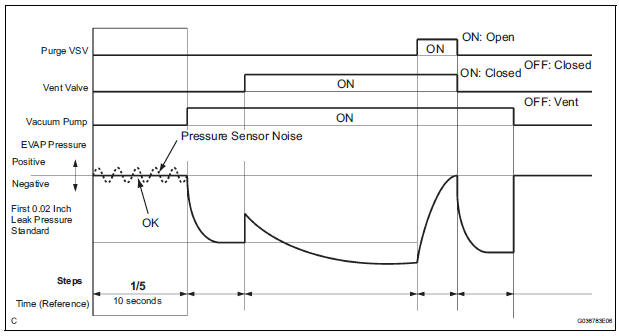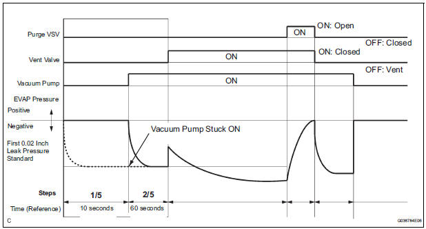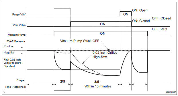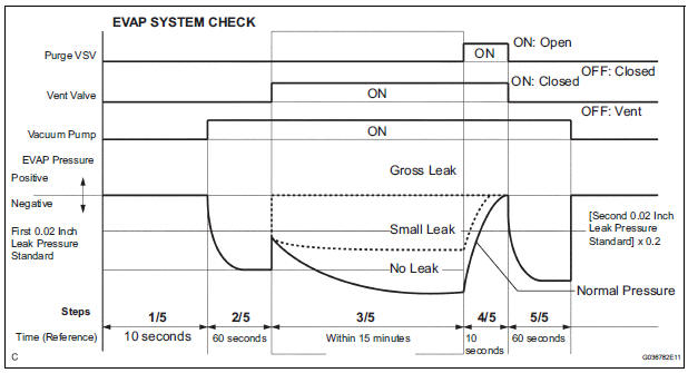 The electric vacuum pump creates negative pressure (vacuum) in the EVAP system, and the pressure is measured. Finally, the ECM monitors for leaks from the EVAP system and malfunctions in both the pump module and purge VSV, based on the EVAP pressure.