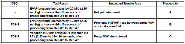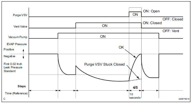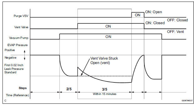 The vent valve is turned OFF (open) and the EVAP pressure is then measured. If the variation in the pressure is less than 0.5 kPa (3.75 mmHg), the ECM interprets this as the purge VSV being stuck closed, and illuminates the MIL and sets DTC P0441 (2 trip detection logic).