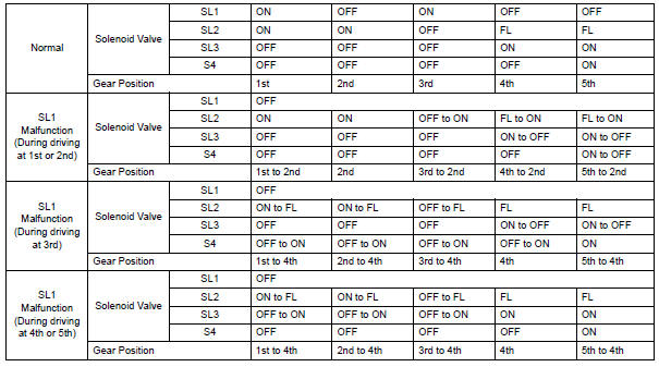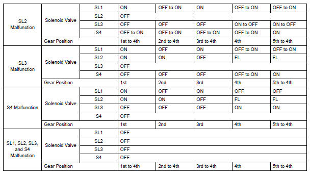 (d) Shift solenoid valve SL1, SL2, SL3 and S4: Fail safe function: If either of the shift solenoid valve circuits develops an open or short, the ECM turns the other shift solenoid "ON" and "OFF" in order to shift into the gear positions shown in the table below.