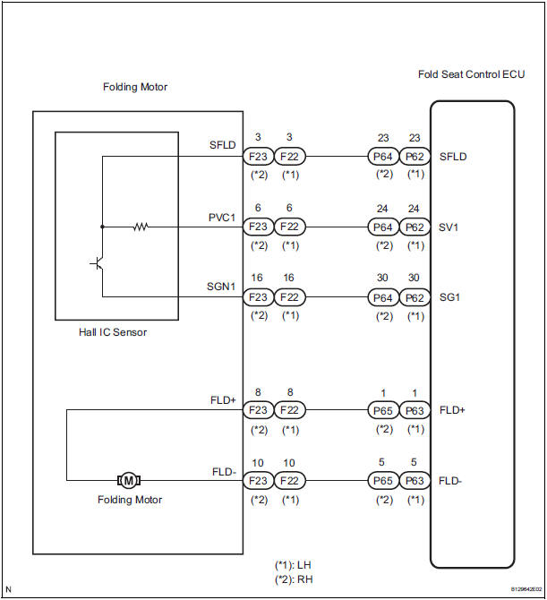 The fold seat control ECU receives a switch operation signal from the fold seat switch and activates the folding motor. At this time, the Hall IC (seat cushion position sensor) detects the actuation signal. The fold seat control ECU uses signals from the Hall IC (seat cushion position sensor) to detect if an object if an object is caught or if any other abnormal condition has occurred.