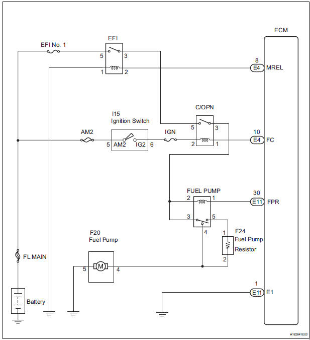 This causes current to flow through the fuel pump resistor to the fuel pump. The fuel pump then operates at low speed. The FUEL PUMP relay is turned OFF while the engine is cranking or operating at high load. The fuel pump then operates at normal speed.