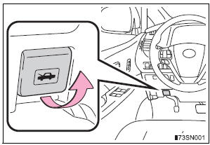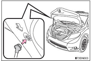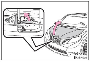 | WARNING Pre-driving check Check that the hood is fully closed and locked. If the hood is not locked properly, it may open while the vehicle is in motion and cause an accident, which may result in death or serious injury. After installing the support rod into the slot Make sure the rod supports the hood securely from falling down on to your head or body. |