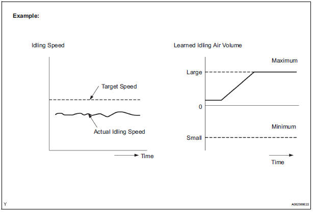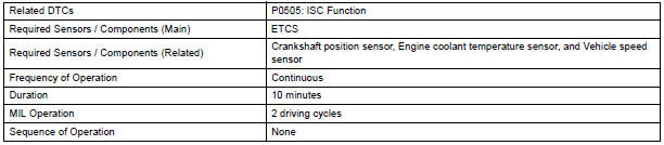 The ECM monitors the idling speed and idling air flow volume to conduct Idle Speed Control (ISC). The ECM determines that the ISC system is malfunctioning if the following conditions are met: