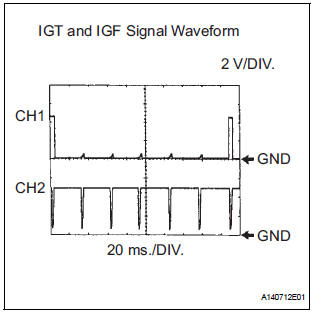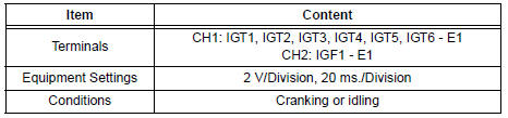 While cranking or idling, check the waveform between terminals IGT (1 to 6) and E1, and IGF1 and E1 of the ECM connector