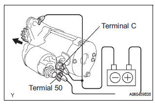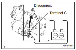 (1) Maintain the battery connections in step (a), but disconnect the negative (-) lead from terminal C. Check that the pinion gear remains extended.