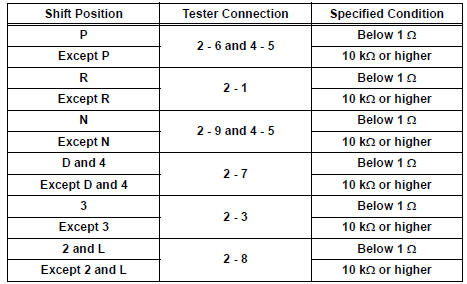(c) Measure the resistance according to the value(s) in the table below when the shift lever is moved to each position.