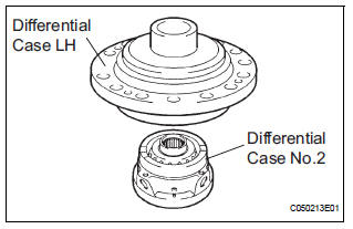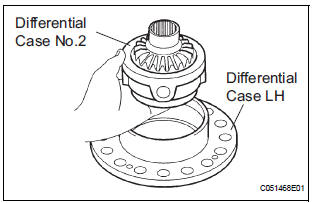 b) Temporarily install the differential side gear thrust washer No.2 LH, center differential side gear conical spring washer and differential case No.2 to the differential case LH.