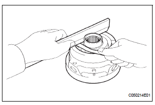 (e) Using a straight edge and feeler gauge, measure the clearance between the front differential case and the front differential side gear.
