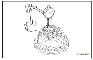 (e) Pressing and holding the differential spider toward the differential intermediate case, measure the pinion's backlash with a dial indicator.