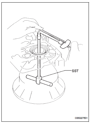 (f) Using SST and a torque wrench, measure the turning torque of the differential case assembly.
