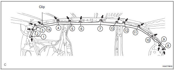 HINT: Refer to the procedures from "INSTALL ROOF HEADLINING ASSEMBLY" (4).