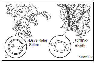 (d) Align the oil pump's drive rotor spline and the crankshaft as shown in the illustration. Install the spline and chain cover to the crankshaft.