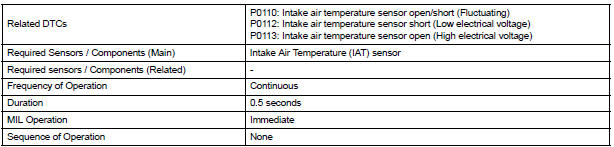 | P0110 | Step 1 | Open or short in Intake Air Temperature (IAT) sensor circuit for 0.5 seconds (1 trip detection logic) |
